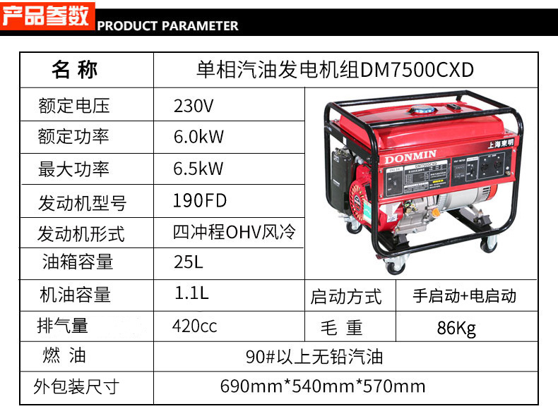 單相6千瓦汽油發(fā)電機(jī)組電啟動(dòng)DM7500CXD【帶移動(dòng)輪】