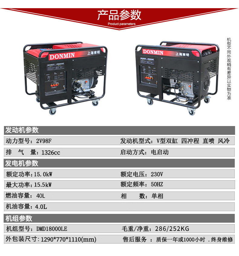 - 上海東明單相12KW 12000W柴油發(fā)電機組DMD15000LE ◆采用雙缸V型結(jié)構(gòu),動力強勁; ◆大型消音器,動平衡轉(zhuǎn)軸,低噪音機組設(shè)計,采用具有減震功能的外殼與框架; ◆大容量油箱確保長時間的連續(xù)工作; ◆無熔絲斷路器提供過載保護,電容電壓調(diào)節(jié)器,確保穩(wěn)定電壓輸出; ◆定向輪加萬向輪結(jié)構(gòu),移動方便。